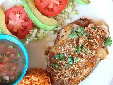 Tilapia marinated in garlic sauce and topped with avocado slices. Served with rice and charro beans. 18.99