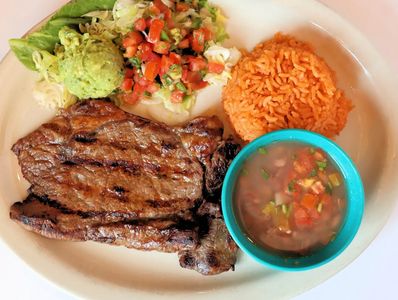 Thin Ribeye steak served with charro beans, tortillas, rice, pico de gallo, and guacamole. 20.99