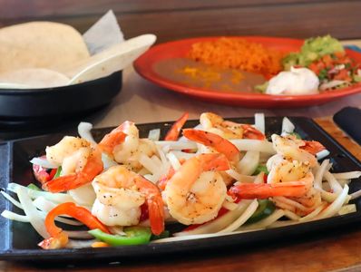 Fajitas over grilled onions and peppers, served with rice, beans, tortillas, guacamole, sour cream, and pico de gallo.
